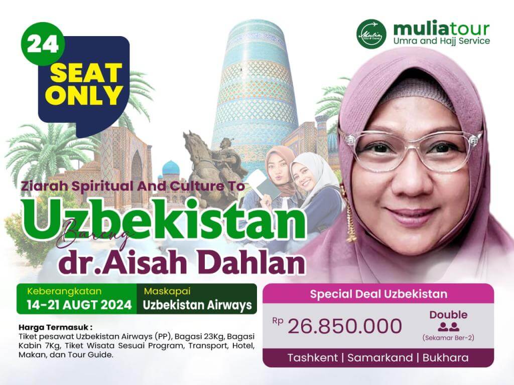 Tour Ziarah Menelusuri Sejarah Islam bersama dr. Aisah Dahlan CMHT., CM., NLP. dengan menjelajahi Kota Tashkent, Samarkand, dan Bukhara, serta mengunjungi tempat peristirahatan para ulama besar Islam, diantaranya perjalanan menuju ke Kompleks Monumen Peringatan Imam Al Bukhari (kolektor hadits “Sahih al-Bukhari”) dan Kompleks Arsitektur Khadja Bahauddin Naqsyband.